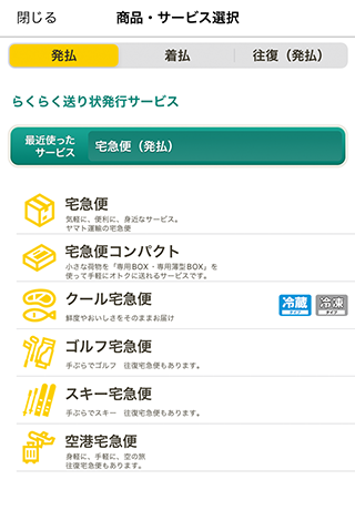 3.発払・着払・往復(発払)を選択し、ご希望の商品を選択します。