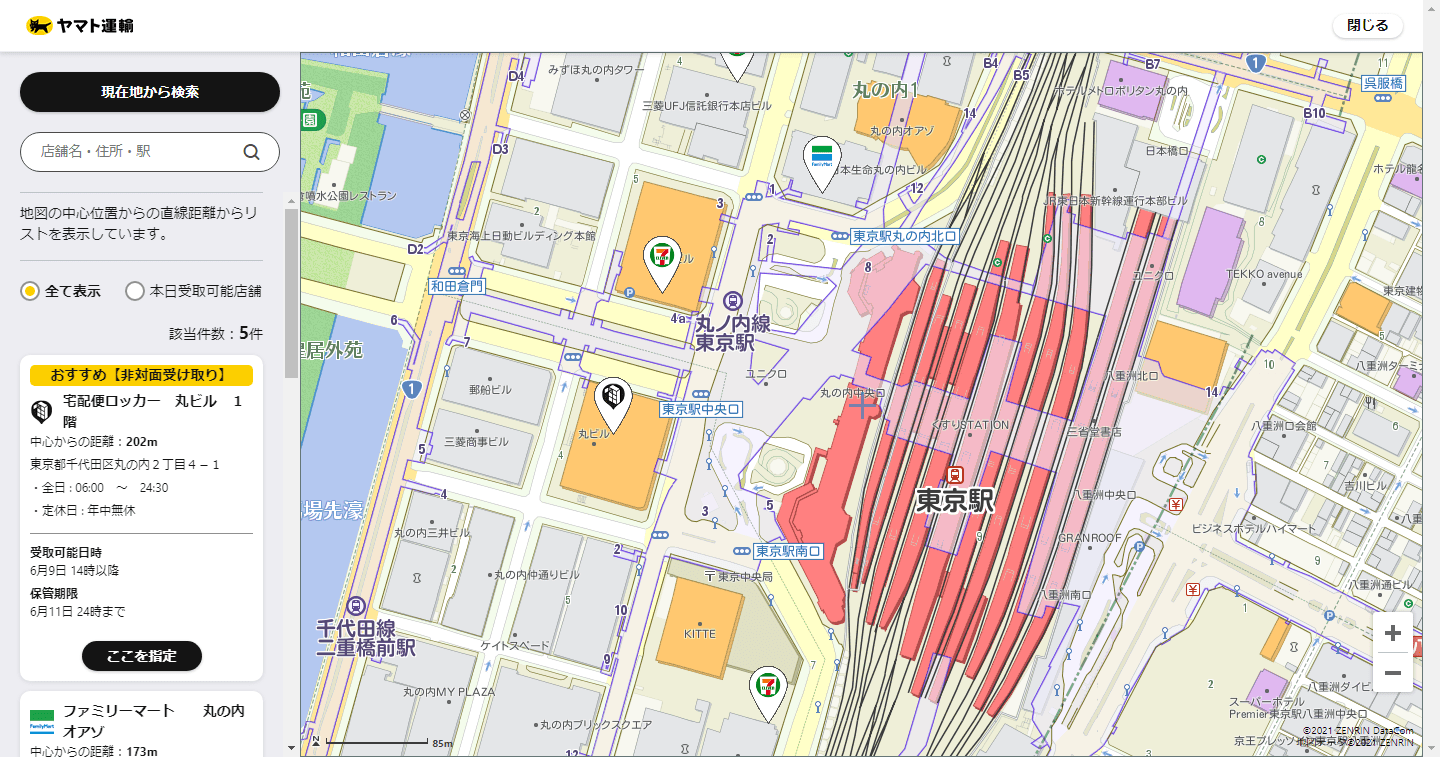 指定可能なヤマト運輸営業所・取扱店が、一覧と地図で表示されますので、ご希望のヤマト運輸営業所を選択してください。