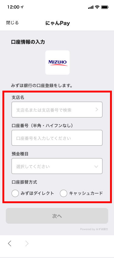 口座情報(支店名、口座番号、預金種目、口座振替方式)を入力
