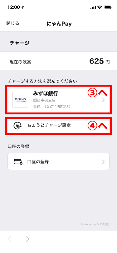 チャージ方法(登録口座または「ちょうどチャージ」)を選択