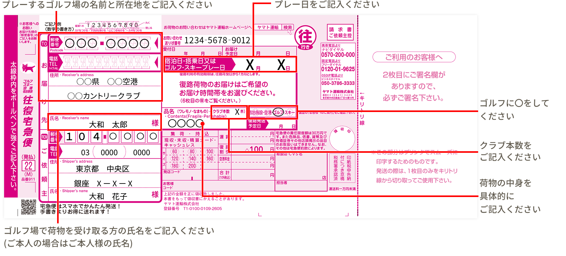 • ゴルフ場でお荷物をお引き取りの際には、送り状の「ご依頼主控」と引き換えになりますので、必ずご持参ください。