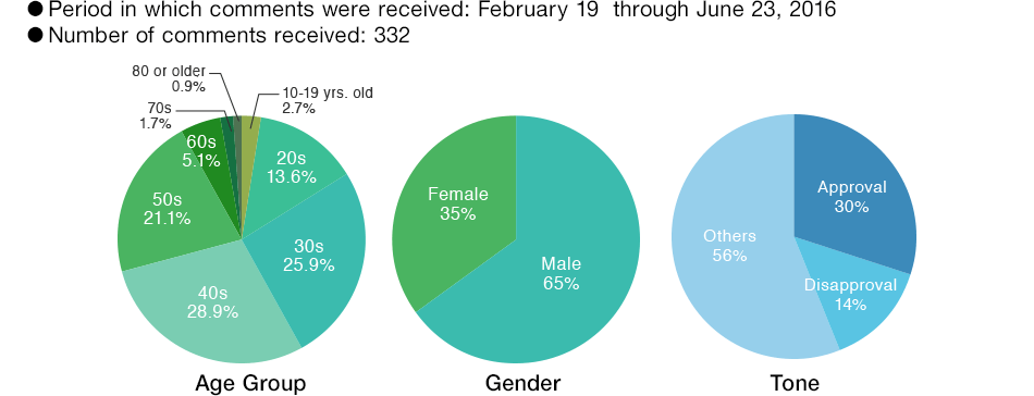 Breakdown of respondents by age group, gender, and tone of comments are shown in the graphs below.