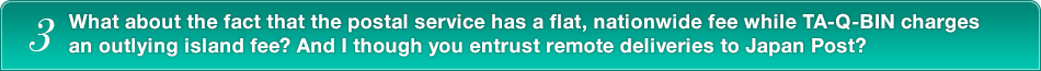 TA-Q-BIN does use a zone-based fee system but does not charge an outlying island fee. Furthermore, we deliver to outlying islands and remote areas using our own network, we do not hire Japan Post for these deliveries.