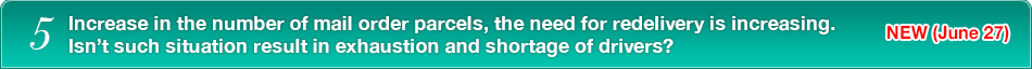 The shortage of drivers is now a serious issue. On the other hand, the number of package to be delivered is increasing, with more chance of the addressee not being home to receive them. Immediate consideration for measures to deal with the redelivery issue due to addressees' absence is required.