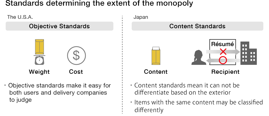 In contrast, Japan bases the extent of its monopoly on “delivery of correspondence,” using content standards that stipulate what is and is not a correspondence based on the content of the message. Beyond that, the system penalizes not only the delivery company but also the sender for infractions.