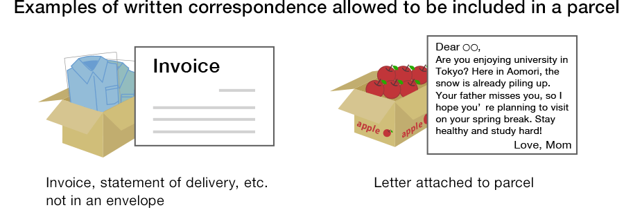We have received many inquiries, like those above about sending a letter with a book, messages and other notes or a letter of congratulations and personal update, and these are classed as “accompanying notes” included in parcels so there is no need to worry. Accompanying notes are simple salutatory messages directly related to the parcel and have always been allowed (Guidelines on Correspondence [MIC notice no. 270, 2003]).