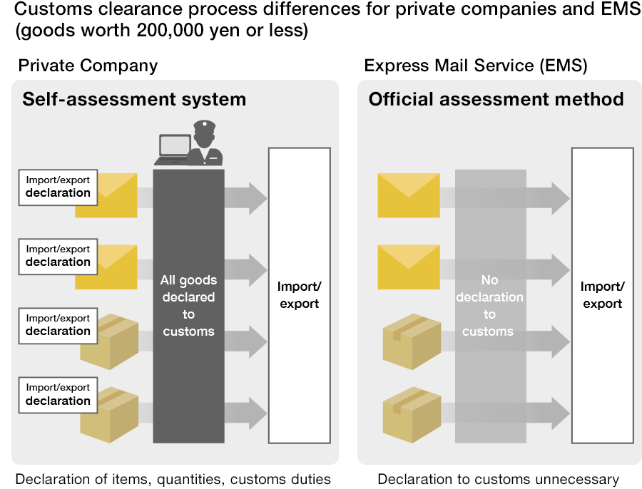 Unlike in the case of private businesses, the official assessment method is applied (instead of the self-assessment method) for customs clearance for any Express Mail Service (EMS) package containing items with a total value of 200,000-yen or less. The official assessment method is not about totally skipping the inspection process. Customs officials will review the paperwork to confirm that contents of each package are not restricted or prohibited items for export/import. Therefore, as you have pointed out, a parcel may be returned if it was found to include a restricted or prohibited item. Diagram 7-1 above illustrates the fact that, unlike the self-assessment method applied to private businesses, the official assessment method does not require the importer/exporter to declare to the customs to gain clearance.