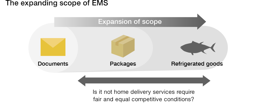 EMS is in a competitive position against private businesses in Japan and abroad in the area of small cargo delivery services. Nevertheless, it is being uniformly treated as a universal service, and customs clearance and quarantine systems being applied differ from those applied to private businesses. These differences place them in a position of superiority over private businesses both in terms of operation and costs.