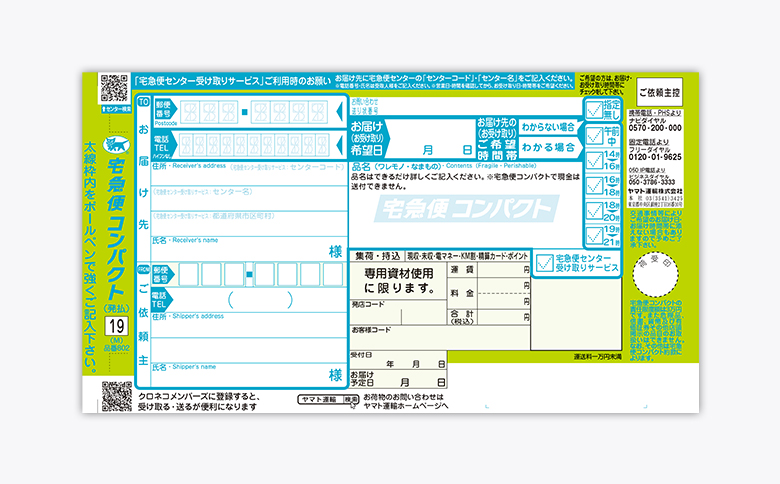 Waybills are available at nearby Yamato Transport Sales Office, convenience stores, and TA-Q-BIN Agencies.