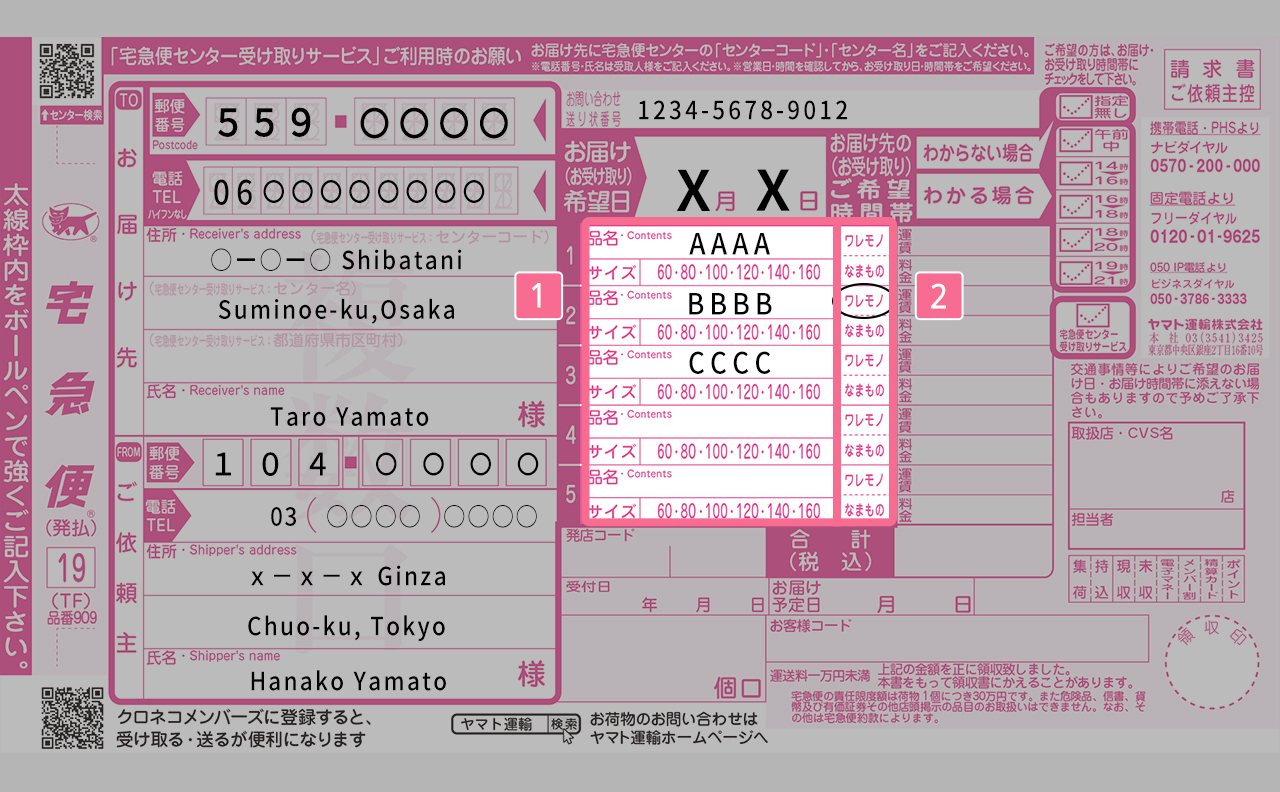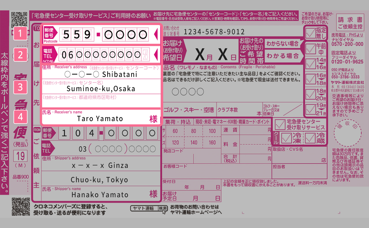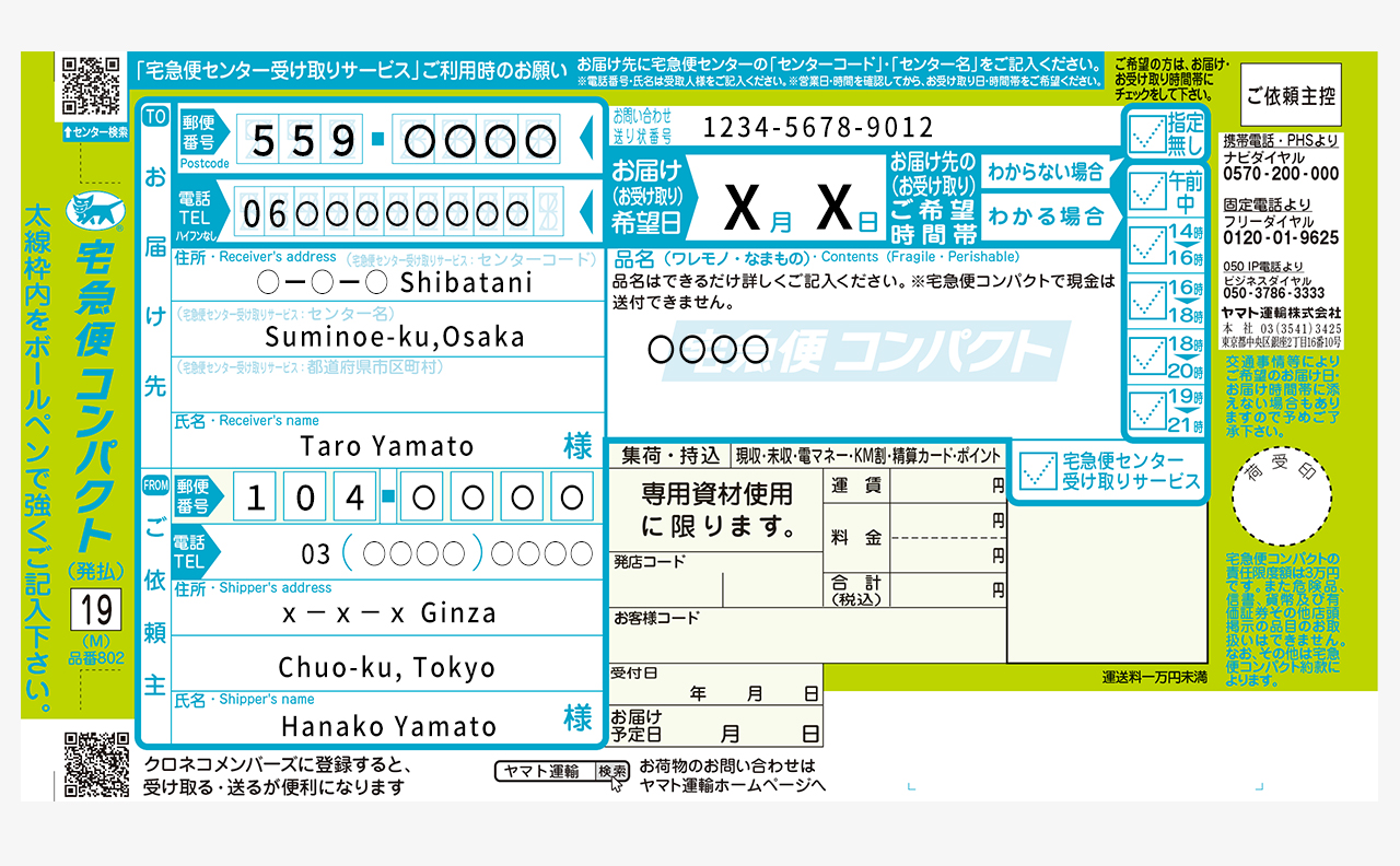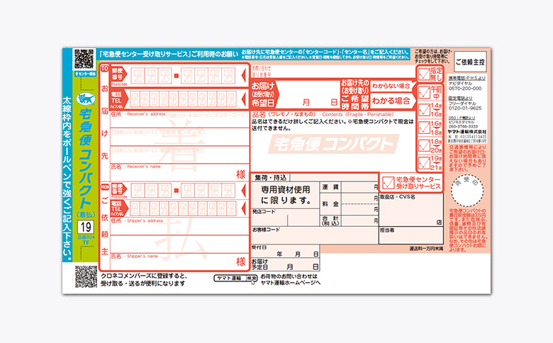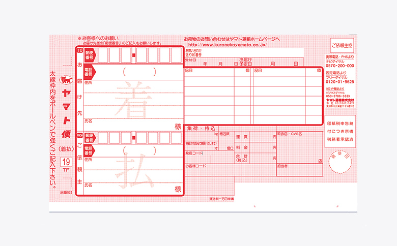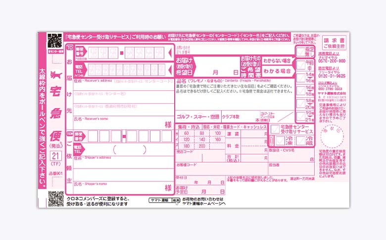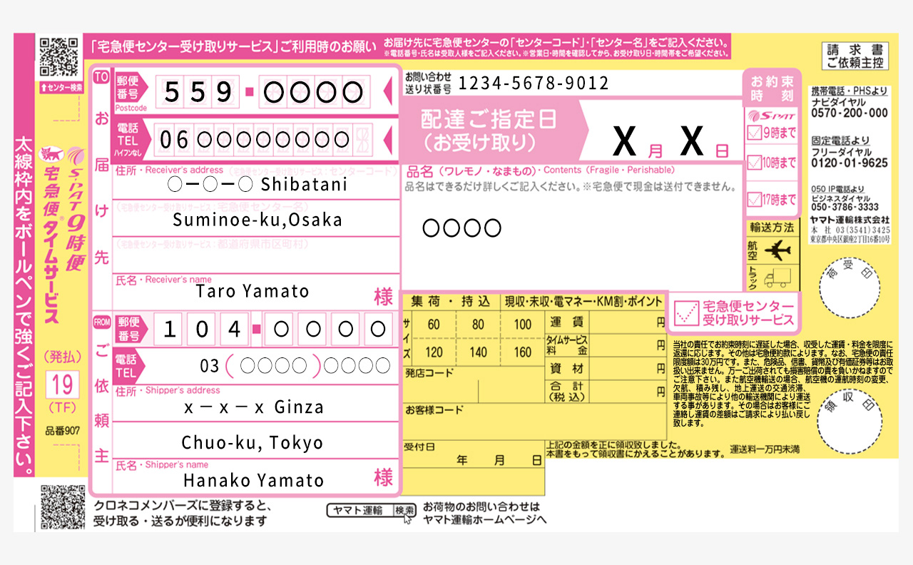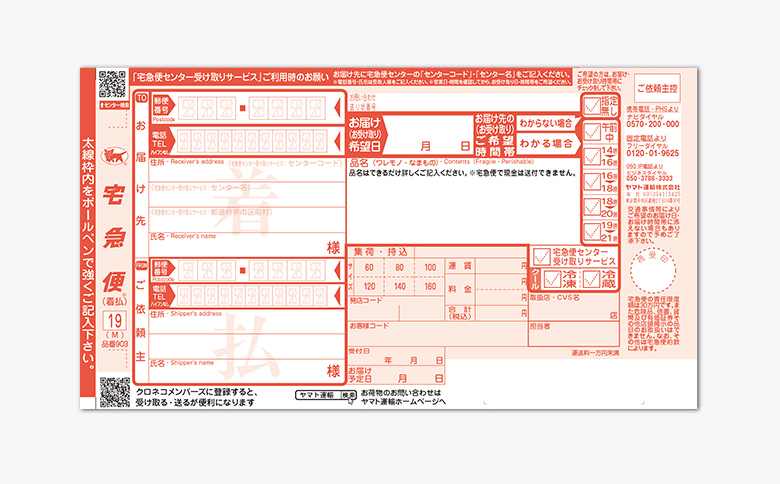 - *It is not possible to specify a delivery date or time zone for YAMATO-BIN. Therefore, there is no corresponding section on the waybill.