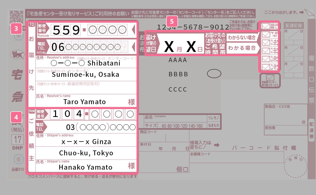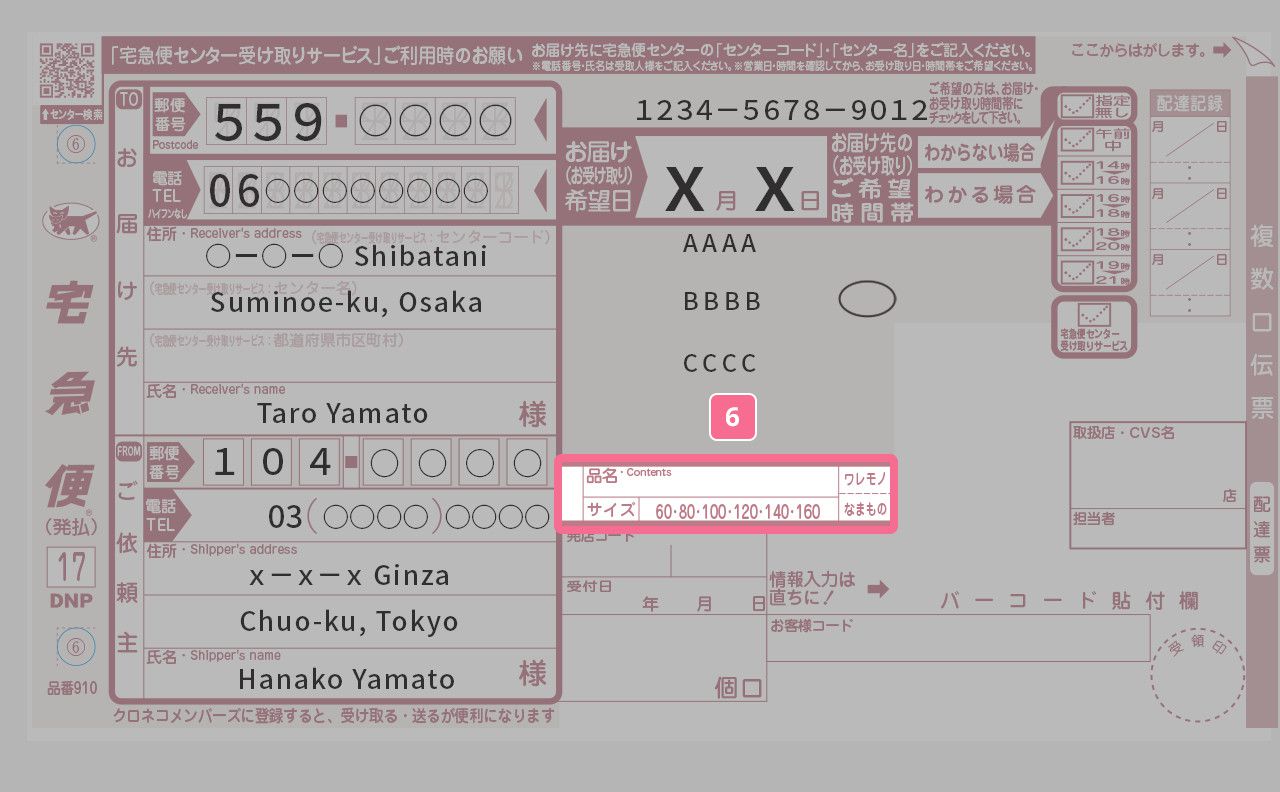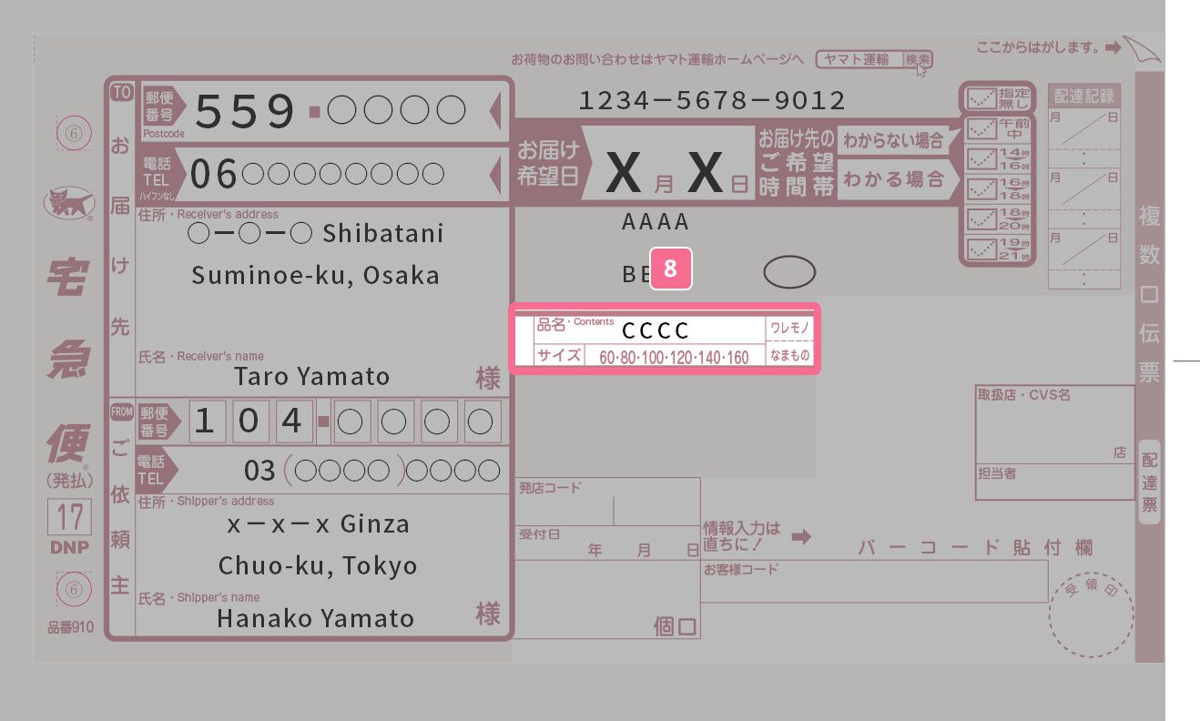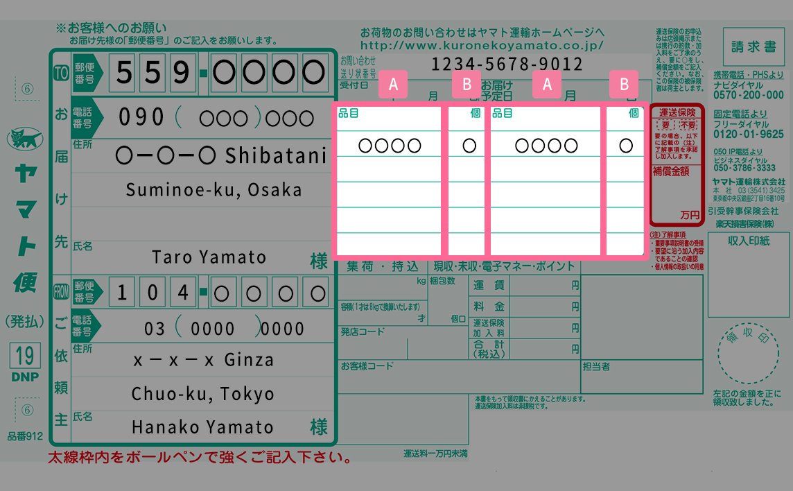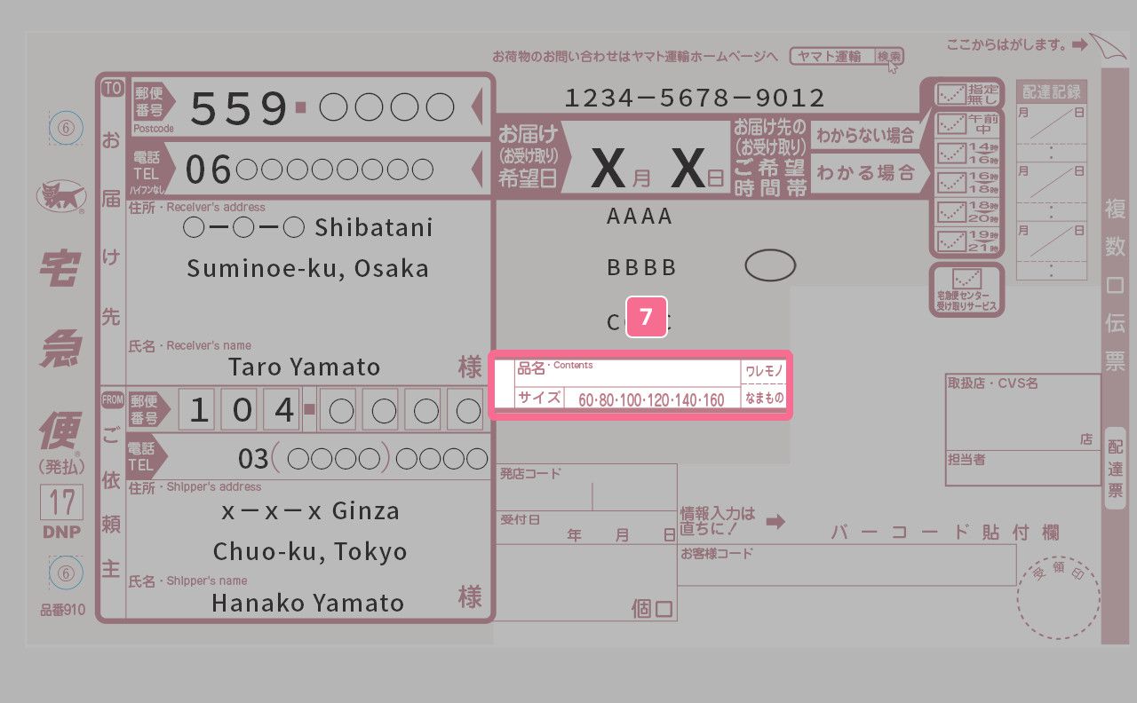 - *It is not possible to specify a delivery date or time zone for YAMATO-BIN. Therefore, there is no corresponding section on the waybill.