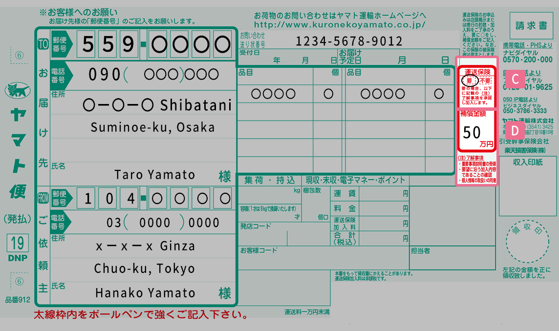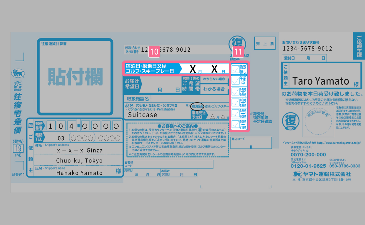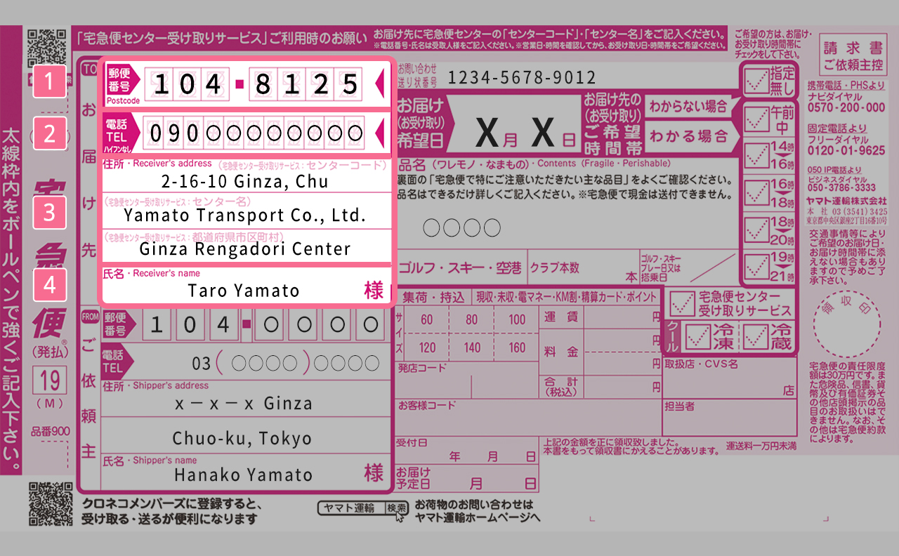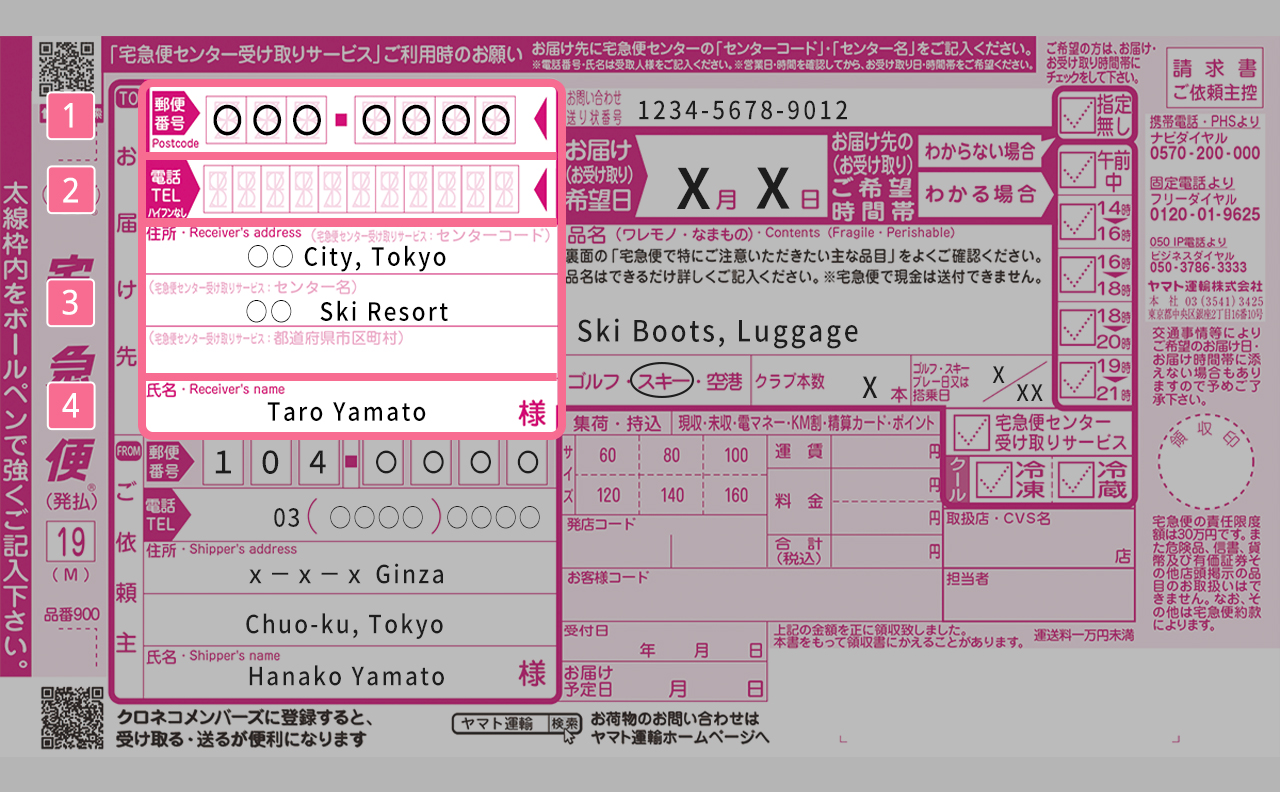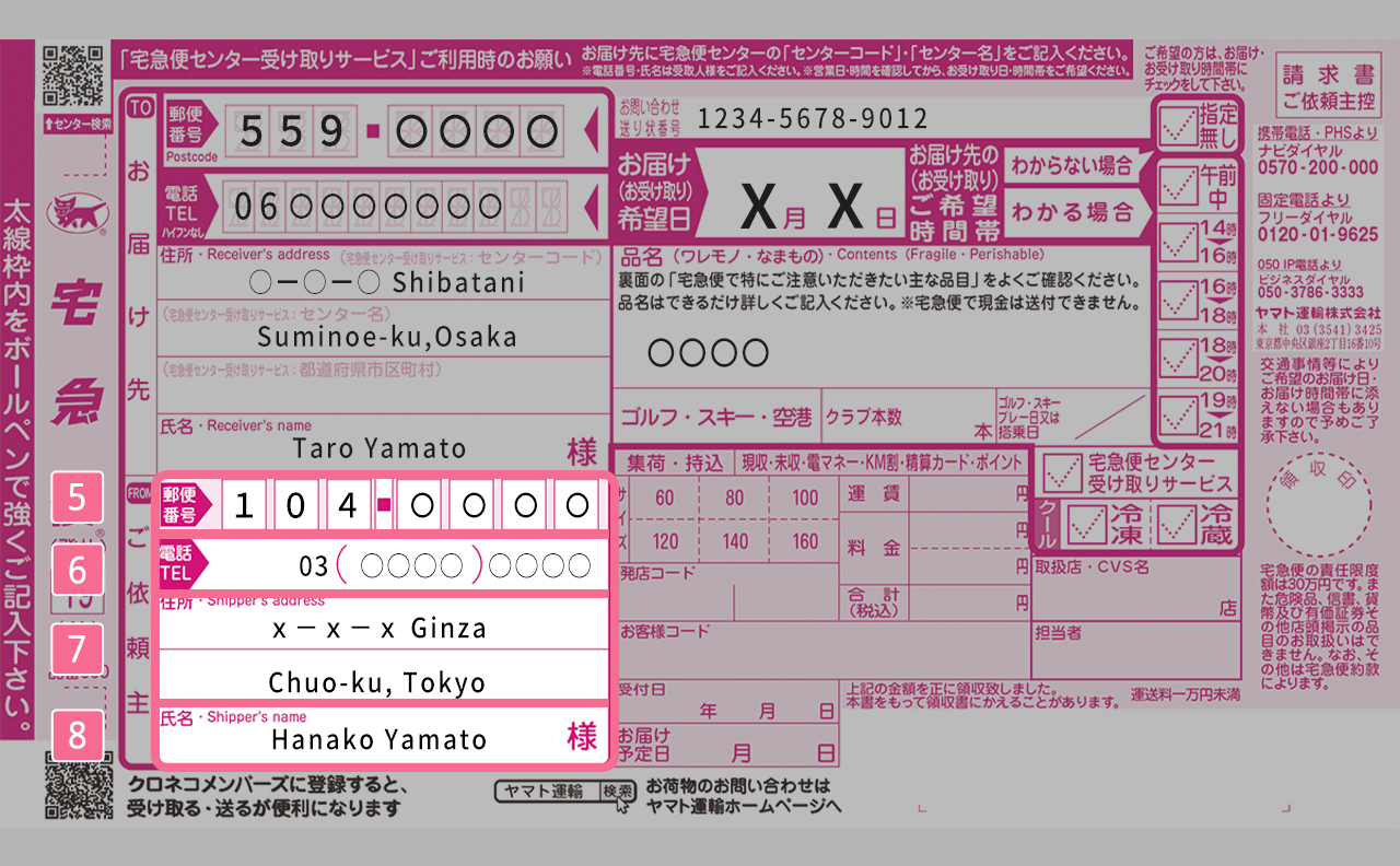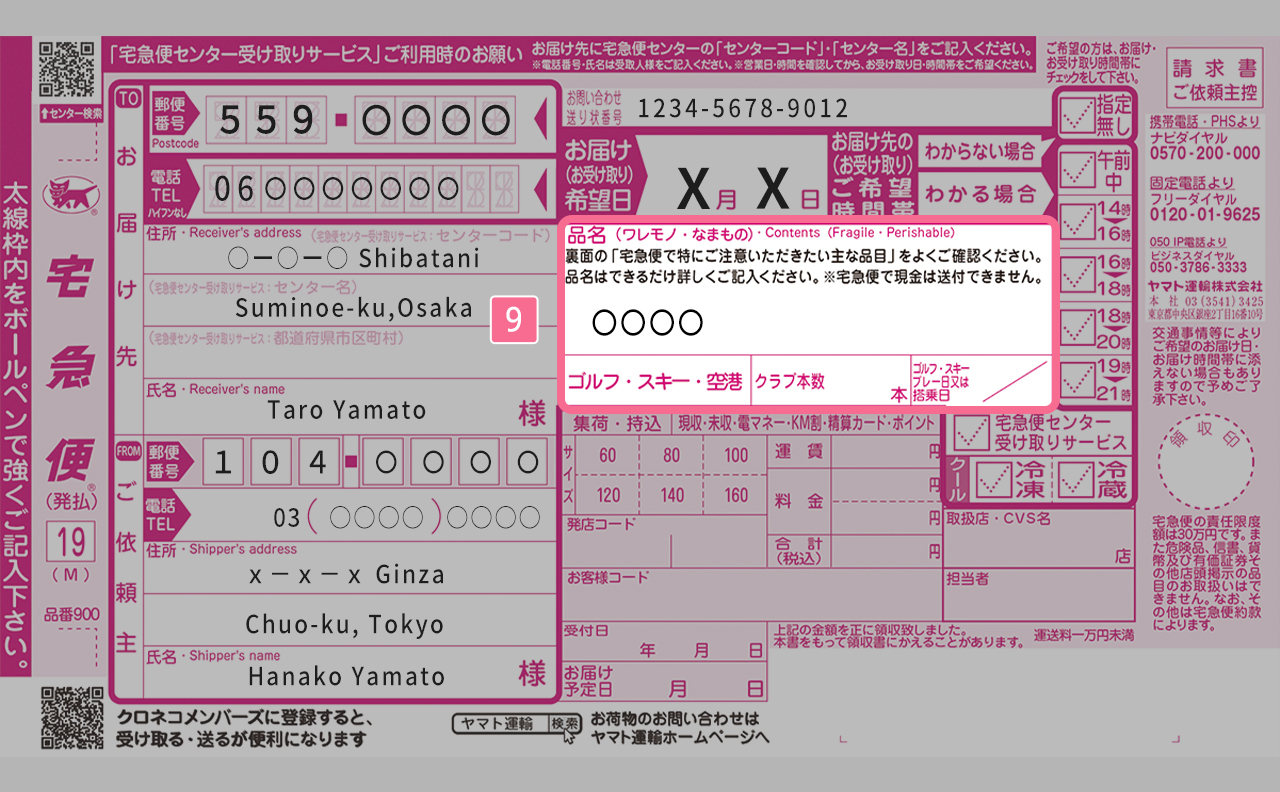 - *It is not possible to specify a delivery date or time zone for YAMATO-BIN. Therefore, there is no corresponding section on the waybill.