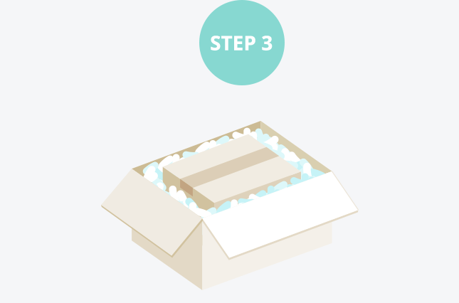 Put the inner (smaller) box into the outer (larger) box. Use cushioning materials to fill in any gaps and position the inner (smaller) box in the center of the outer (larger) box.