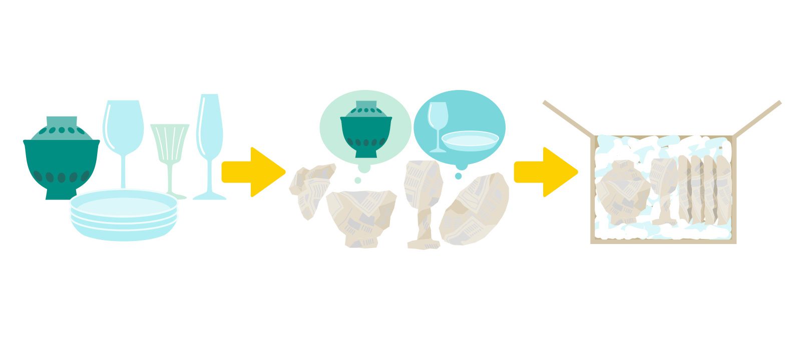 Wrap each item in cushioning material such as newspaper or bubble wrap.