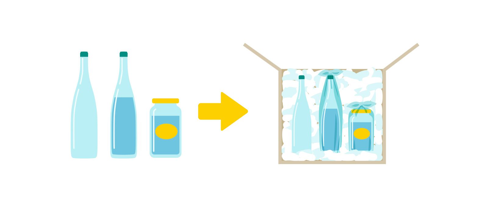 Firmly insert corks/stoppers. If there is a risk of leaking, place the bottle in a plastic bag. Wrap in a sufficient amount of cushioning material such as newspaper or bubble wrap.