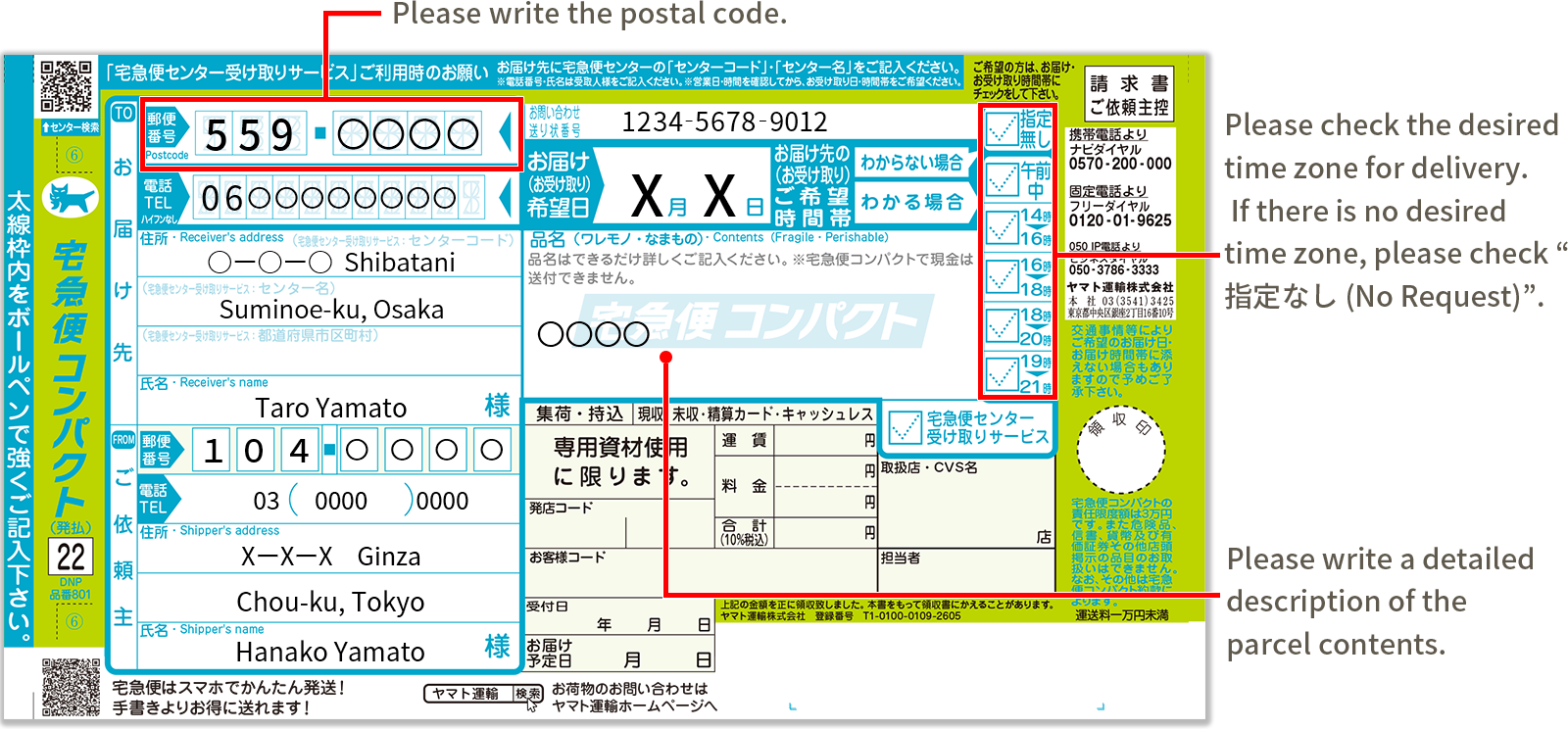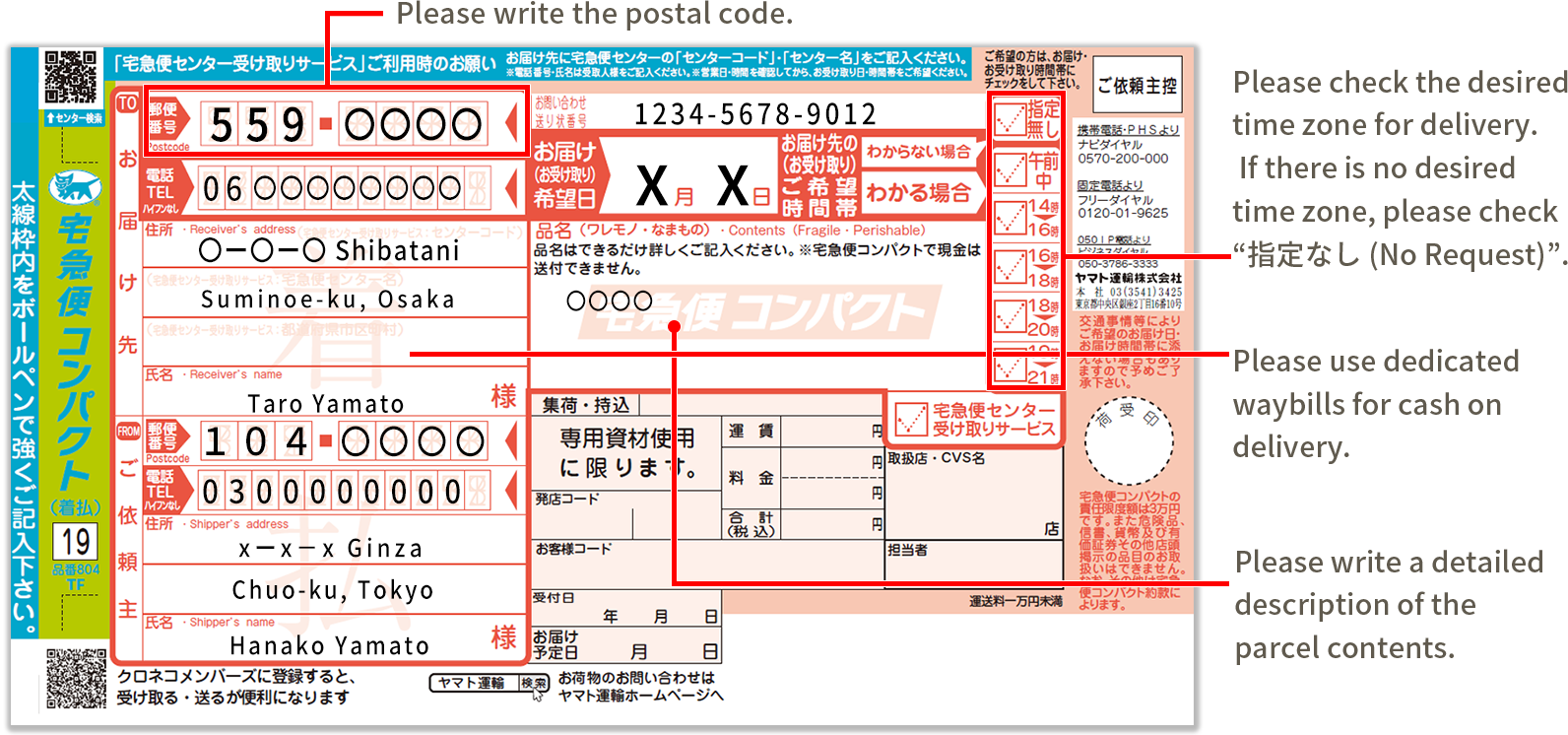 Waybills are available at nearby Yamato Transport Sales Office, convenient stores and TA-Q-BIN Agencies (Japanese Only)