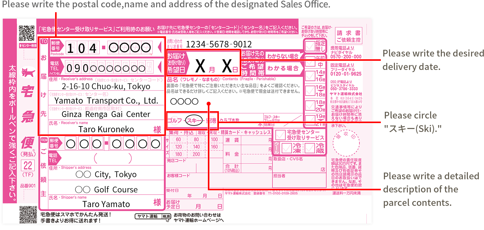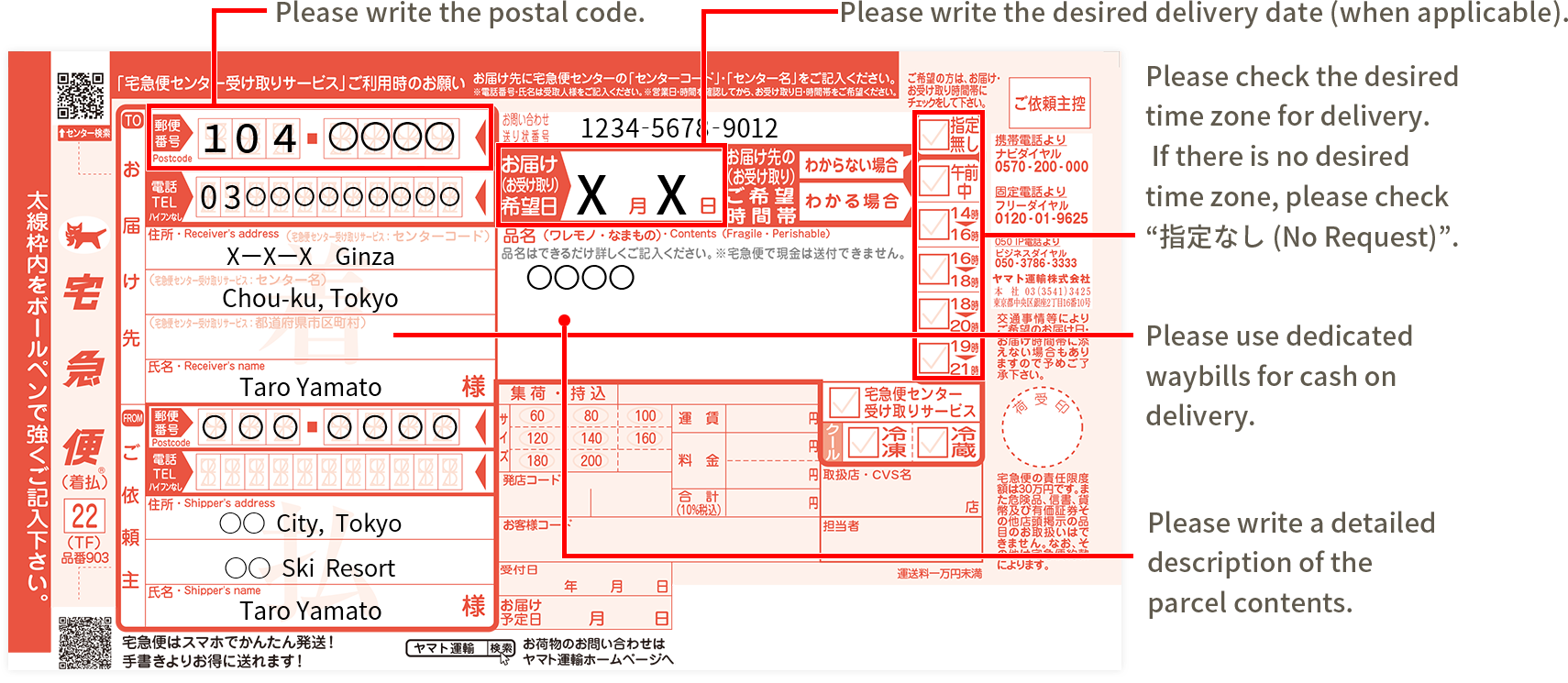 Waybills are available at nearby Yamato Transport Sales Office, convenience stores and TA-Q-BIN Agencies.