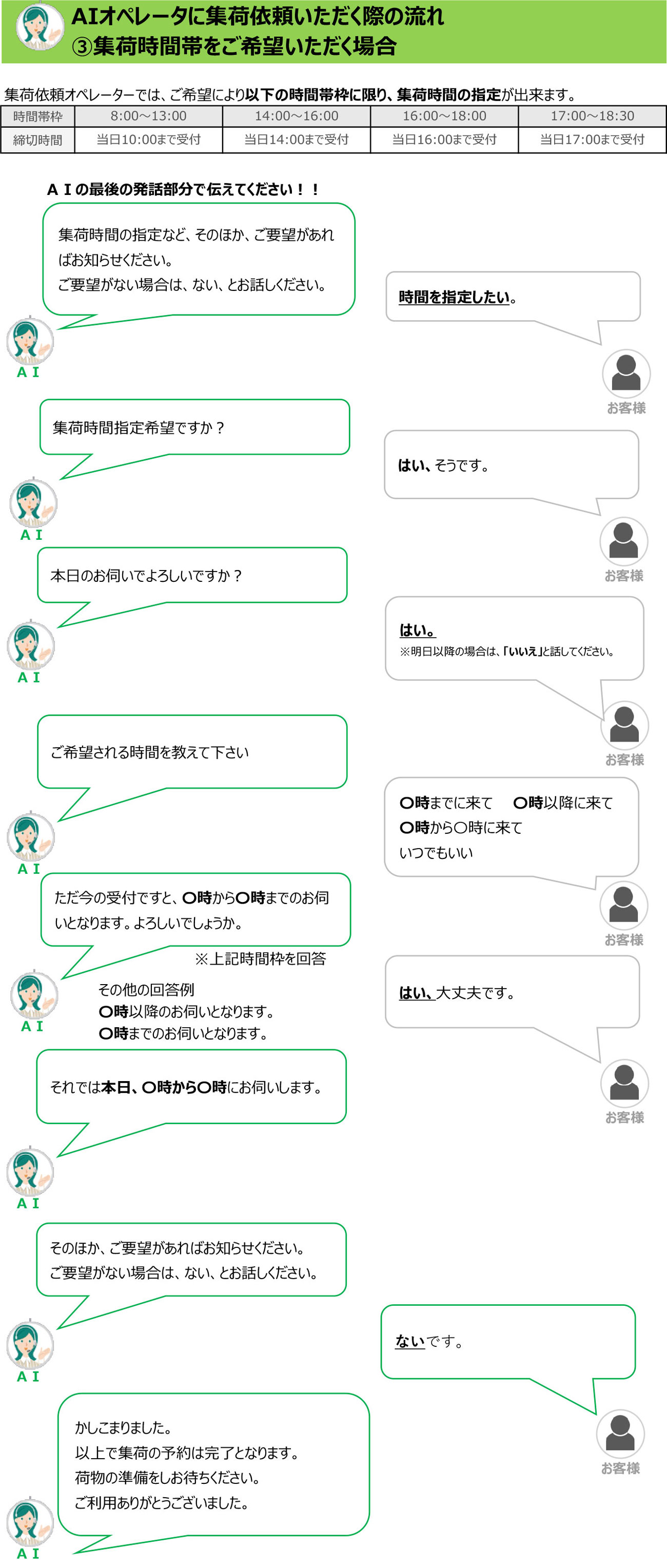 - 3AIオペレータに繋がりますので、集荷する場所や時間などのご要望をお伝えください。