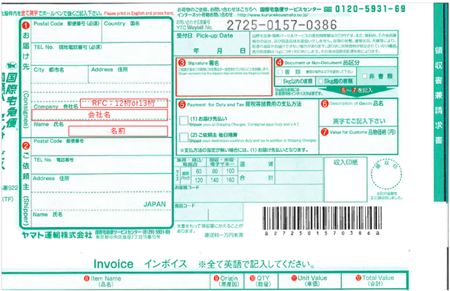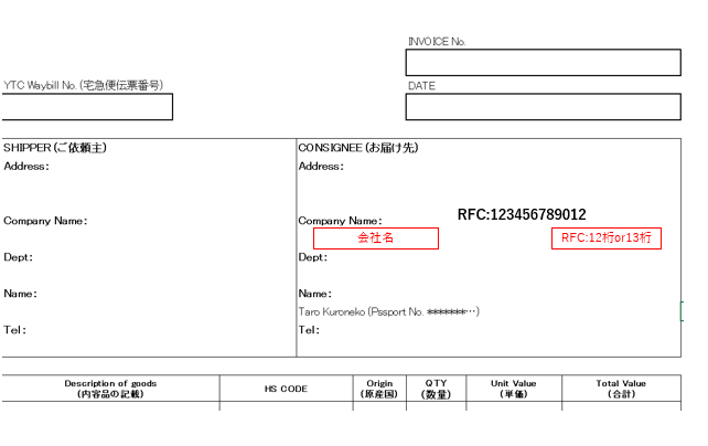 3月23日(日)以降、メキシコ向けに国際宅急便を発送される場合は、送り状とインボイスに納税者番号(12桁or13桁)の記載をお願いいたします。