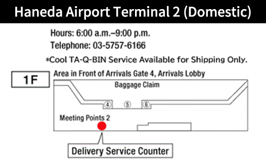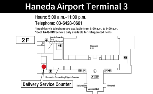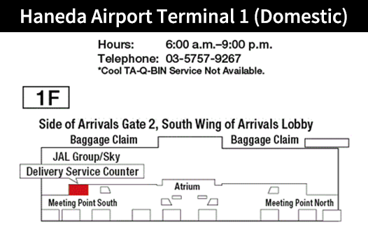 If you bring your luggage to a Sales Office in Tokyo by 11:00, you will be able to pick it up at the TA-Q-BIN Counter in Haneda Airport between 17:00 and 23:00 (*21:00 for domestic flights) on that day.
