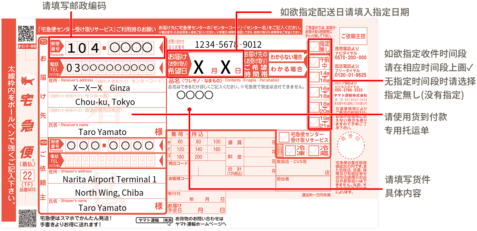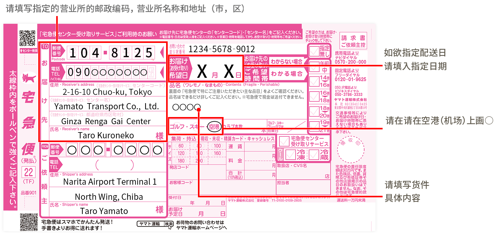 • 「营业所取货服务」不适用于返程的配送,但是可以指定宅急便营业所为目的地,然后可去该宅急便营业所收件。
