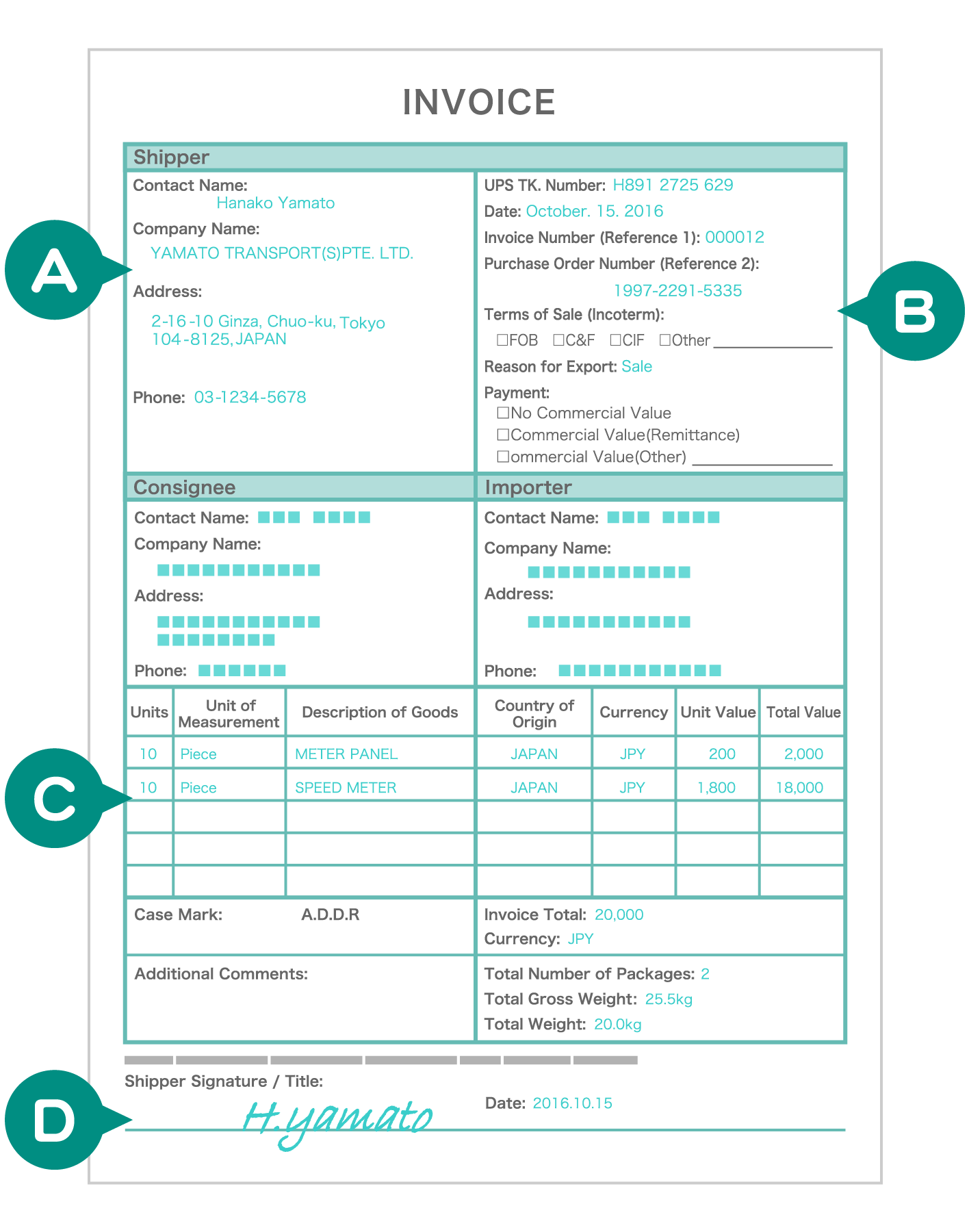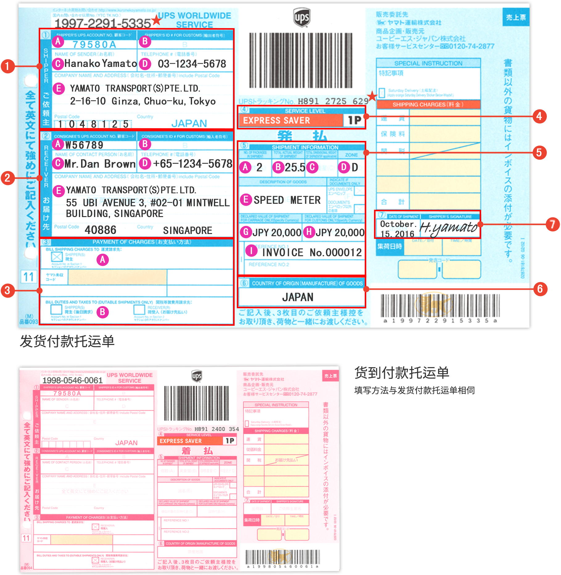 Shipper(寄件人)、Consignee(收件人)的姓名、地址请使用英文正确填写。电话号码亦务必填写。如未填写部门名、负责人姓名等详情可能导致无法顺利配送。