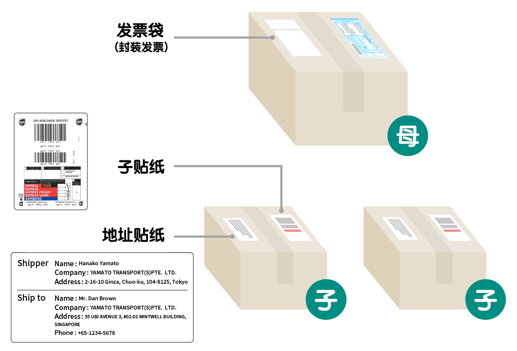 其余的所有包裹(子)请各粘贴1张子标签与地址标签。